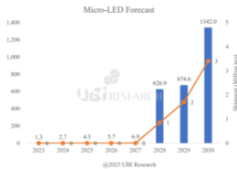 유비리서치가 최근 발간한 ‘2025 Micro-LED Display 산업 및 기술 동향 보고서’에 따르면, 차세대 디스플레이 시장에서 ‘게임 체인저’로 주목받는 Micro-LED가 본격적인 성장 궤도에 오르고 있다. 글로벌 Micro-LED TV 생산 캐파는 2023년 연간 5만 대 수준에서 2030년 약 600만 대로 확대되며, 전체 Micro-LED 시장 규모는 약 13억 달러(US$ 1.342 billion)에 이를 것으로 전망된다.